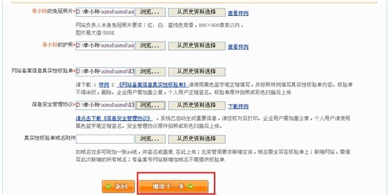 第一步,填寫并提交備案信息 1.1 驗證基本信息:請按照提示輸入信息,系統(tǒng)會驗證信息是否有效。 1.2 填寫網(wǎng)站:請按要求填寫真實的網(wǎng)站信息 點擊“繼續(xù)下一步”會出現(xiàn)提示:是否繼續(xù)增加網(wǎng)站? 2.1上傳資料 點擊“繼續(xù)下一步”彈出提示:是否確認(rèn)提交備案信息? 2.2同意協(xié)助修改協(xié)議; 點擊“提交審核”后,彈出提示信息:已成功提交萬網(wǎng)審核,客戶無法再進行修改操作。 第二步:備案初審 第三步:等待郵寄資料
