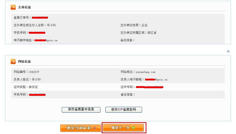 5.核對(duì)填寫的信息,點(diǎn)擊“繼續(xù)下一步” 6.同意萬(wàn)網(wǎng)協(xié)助修改信息協(xié)議;