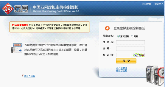 第一步:在瀏覽器的地址欄輸入htt://cp.hichina.com打開(kāi)萬(wàn)網(wǎng)的虛擬主機(jī)控制面板界面;